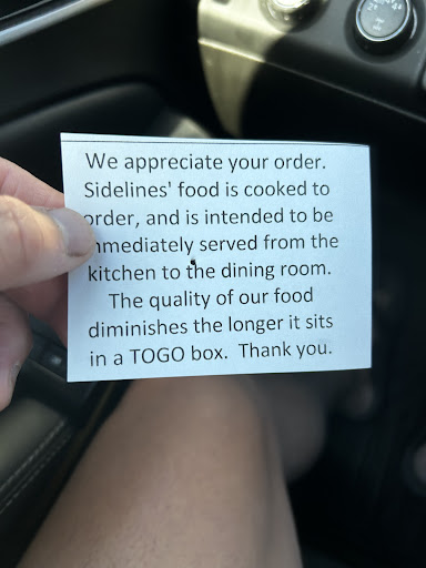 Past 20 plus year met exceptional people, only 2 episodes of bad food. A couple weeks ago talking to a friend and difficulty turning my head since c3-6 budge with nerve encroaching and compression as well as L3 sitting on first level of titanium. Was having discussion with my friend about someone who did me wrong. At same time looking at beautiful woman sitting across from me. She had no idea about my physical condition and nor did the manager who spoke to me like a 2 yr old. I was told when my food arrived I must leave. The guy with other female informed her of misunderstood on her part and she began apologizing. I left anyway since this was second time minding my own business I was accosted. I love sidelines staff and owner. Love going for lunch. Sadly, I refuse to be victimized and treated like crap by a manager who cannot investigate the truth and makes assumptions. I was calm sitting in my seat and she had zero clue. If she saw my MRI photos I had on my phone she would call herself a fool. Instead she said " Don't even try to deny it, I heard what you said". Seriously. I've had 18 orthopedic surgeries and presently need a couple spine surgeries and an orthopedic one. It's not a fix but a bandage on a wound. Management training 101. Don't think you know it all. To other staff,...