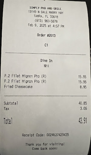 Simply Pho & Grill – A Brothy Treasure Worth Plundering! Arrr, gather ’round, me hearties, for I’ve sailed the seven seas of flavor and dropped anchor at Simply Pho & Grill, where a bounty of broth and beef awaited me! Let me tell ye, this was no mere meal—this was a voyage to pho-nomenal bliss! The Server – Nhi, The High Priestess of Pho The moment we set foot inside, Nhi welcomed us like long-lost sailors returning from the storm, guiding us to our table with the kind of grace ye only see in legends. Attentive, swift, and sharper than a pirate’s cutlass, she ensured our cups were never empty and that our orders arrived faster than a cannonball flyin’ off the starboard side. If every ship had a crew member like Nhi, we’d all be sailin’ first class! The Feast – A Brothy Masterpiece Worthy of Kings • Filet Mignon Pho – Listen, matey, this ain’t just soup—this be a potion brewed in the cauldron of the gods themselves! The broth? Richer than a chest full of Spanish doubloons, infused with a symphony of spices that whisper sweet nothings to yer soul. The filet mignon? Tender as a mermaid’s kiss, floating in that golden elixir like jewels in the sea. One spoonful, and I was ready to trade me ship for a lifetime supply! • The Herbs & Garnishes – A plate o’ freshness fit for a jungle expedition! Crisp bean sprouts, fragrant Thai basil, fiery jalapeños, and zesty lime—a perfect arsenal to customize yer broth like a true sea captain chartin’ his own course. • Fried Cheesecake – If the sirens ever wanted to lure me to my doom, this would be the dessert they’d use. Crispy, golden perfection on the outside, molten, creamy delight within. A dessert so dangerously good, I’d gladly risk mutiny just to have another bite! The Verdict – The True Hidden Gem of Tampa! Simply Pho & Grill be no ordinary tavern—nay, this be a sanctuary for those who crave bold flavors, hearty portions, and legendary service. If ye be seekin’ pho so good it’ll have ye questionin’ yer life choices, set sail for this fine establishment and let Nhi be yer guide to soupy salvation. 🌊 Five outta five anchors—would plunder again! ⚓🍜
