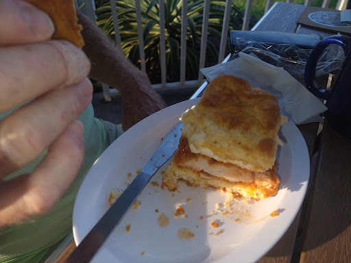 The restaurant and the Lanai looked clean and tidy. Indoor seating only offers hard chairs and hard bench seats. The outdoor seating overlooks a lovely pond. Unfortunately, again, the seats leave a lot to be desired. Unless your bottom's 12" or less in the sitting position your hips will be painfully wedged between two hard metal bars. I ordered the Firehouse dog Cafe mocha and was asked whether I wanted it hot or cold. I selected cold but I was not told that it was going to cost $1 extra just to throw my coffee over some ice. It was delicious! The Phil E Burrito was huge and more than enough for two people. It's loaded with shaved steak, bacon, green peppers, onions, hash browns, scrambled eggs provolone & American cheeses, and fire mayo. I omitted the mushrooms. The fire mayo was HOT!! The burrito had a great flavor but was extremely greasy. I had to wrap it in napkins and the grease soaked through them. There was a pool of grease left on the plate. You are offered gravy for an additional charge of $2.00. The Honey Hot Chicken Biscuit had a nice hot/sweet flavor -a great combination. The chicken was crispy and the biscuit homemade & delicious. An egg was offered as an addition to the biscuit and is listed on the bill as an additional $1.50. The menu is inventive and enticing. Flavors were great. Service was just a bit above average. All the servers were friendly. We probably will go back but will have to sacrifice the al fresco dining experience because of the horrible outdoor seats. My only other complaints are the square handled knives which are so popular with lower class restaurants. Those pointy tips dig into one's hand when using that utensil. The napkins are about the cheapest grade available and you will go through a dozen of them especially when your food is...