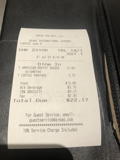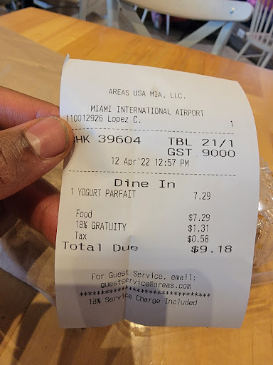Ā Ā Ā Read moreVisited the Miami airport for a connecting flight and was treated very rude, unfair and disrespectfully. My wife and I had just gotten through customs and we arrived in a hurry. It had been a very long day in an international flight so we ordered our food to go, because our flight was scheduled to board in 10 mins, however the flight was delayed shortly after our food was ready so we went back and asked to sit inside the restaurant to eat because our flight was delayed and I was immediately rejected by Laura, who appeared to be annoyed that to took her attention away from texting on her phone and when I asked if we could sit at a high top table to eat our food we purchased she immediately flung her hand up and frowned her face telling us we could not eat inside since we ordered our food to go. Even after asking politely and attempting to explain why we ordered to go she cut me off sayung "To go is To go.. Sorry" and walk off... It is a Wednesday evening at 8:30pm and there was 1 table (a couple) in the restaurant sitting and eating. I spoke with the manager on duty who seemed to not care or assist with a resolution to my concern. I spent over $45 on two meals and had to eat it beside the trash can. I would NOT recommend this...