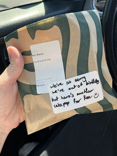 Read moreI added an order of coffees and a couple of cake pops to my Target drive up order today as a special treat for myself and my family who has been knocked down all week by some terrible cold virus. My two toddler girls were so excited to get their cake pops but I realized when we parked for our pick up that one flavor of cake pop had been canceled, I assume because they must have run out. As a sick and exhausted mama I was bummed but quickly decided I would drive to Elianos for a replacement cake pop to avoid having to unload the sick kids and go into Target to choose a different flavor. I checked my Starbucks bag when we were almost at Elianos and was so pleasantly surprised to see a note attached to the cake pop bag saying they were sorry they were out of the birthday cake flavor but they had added a second cookies n creme cake pop free of charge! Starbucks really made my day today with 10/10 customer service. Thank you!!! Oh and the coffees were...