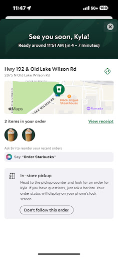 My daughter made a mobile order from our resort at 11:47 am. We are literally across street at the Westgate Resort. Arrived at the Starbucks around 11:52. Watching everyone pick up their orders from mobile to in store orders. Store is very busy however quieted down and I noticed our order was not ready. I went to the front to confirm they had it the gentleman looks and sees there is an order however after confirming with others the order is closed and pick up per the associate from the window. The order said someone picked up at 11:47 am however didnāt understand how that can be when we placed the order at 11:47 am from the resort. I showed the mobile order and receipt. The associate stated a man stated the name and confirmed it was his order inside at the mobile order station. Stories are getting mixed up because one said for the window and the other stated from the mobile station inside. The manager (Cat stated my order was picked up and they said the exact name. Well as I am telling her that canāt be she is being rude and not understanding as if I am lying. I am showing her all of the receipts and order place and she is still telling me it has been picked up. Someone finally makes the order with no urgency. This is when I find out the manager is Cat and her nonchalant behavior is not impressing me after I confronted her about how the situation was handled. As a manager as reputable place you should represent better. I was so embarrassed trying to prove that the order was not picked up! I was fighting for two drinks š¤¦š¼āāļø....