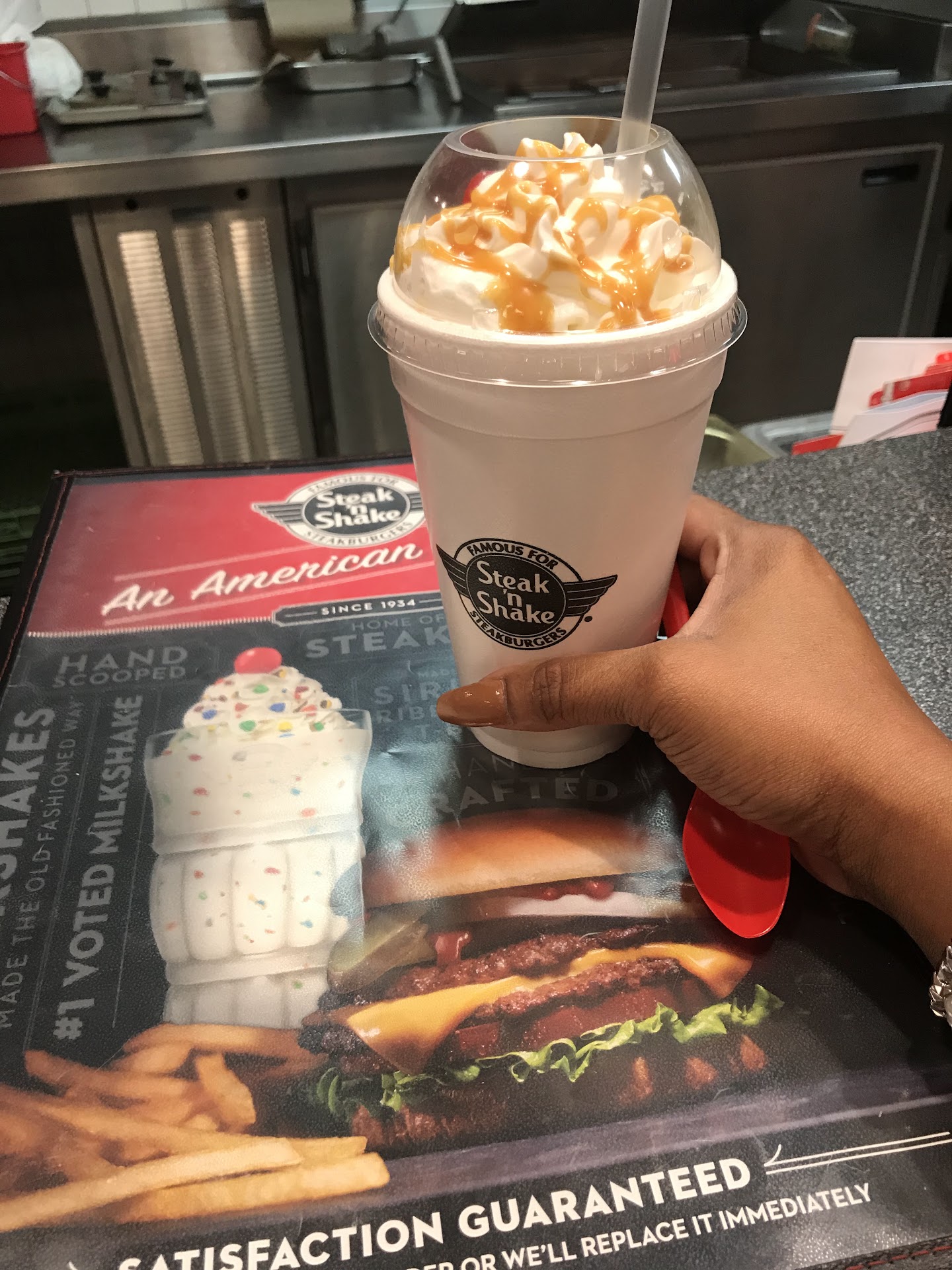 So the shakes were ready and after having to get up again to get spoons, because why include them or even mention that âhey, spoons are over there, get em your selfâ, I almost got a bite of it when the food was ready. Had to get up again for more napkins, twice. Barely heard them call my name, or any customer after us while we sat there eating our extremely greasy burgers that stuck to the paper liner in the plastic basket thingy they served them in.