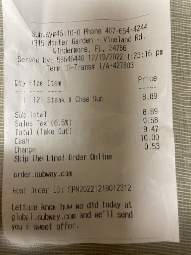 I came to this Subway on 12/19/22 around 12:40 PM. For some reason I was wanting Subway for lunch instead of the sandwich shop I’m most loyal to - Jersey Mike’s which is .1 miles down the road. I walk in and wait in what appeared to be a very short line of only 3 people in front of me. However, they was only one employee working the line, and this review is nothing against her, since I know she’s being overworked for $10 an hour (and honestly if I was her, I would have walked out no joke). The man who was ordering when I walked in took 10-15 mins to finish getting his sandwiches made, and then there were mobile orders she had to focus on. So the two people in front of me were still waiting, while she made nearly 4 orders of “express pickups.” I was the 3rd person that walked in and walked out in the 25 minutes I was in that store, and I can promise you I will NEVER even attempt to walk back into that specific Subway. Subway is Subway - we all know what it tastes like. But if you are SO understaffed that you can’t even keep up with the demand, what’s the point of even being open? Give that poor girl the day off and just close. Your losing just as much money as your making by not being able to keep up with the demand and having walk outs. I rarely write bad reviews, but this was beyond frustrating. I came to the Wendy’s down the street in the drive thru and had my food within 10 mins of entering the line despite having a line of 10+ cars. Get it together Subway (this location...