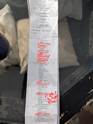 Read moreWe ordered 4 sandwiches through DoorDash. Every sandwich was missing major ingredients, like the cheese on all of them. Mine was pathetic: a smear of tuna, not toasted, no cheese, spinach leaves, olives, pepper, oil, or vinegar, a sprinkle of lettuce, a tomato on each end, a squirt of honey mustard at one end and mayo on the other. Subway is known for a stuffed, huge sandwich. Mine was flat, like a picky child's sandwich who had asked for only two ingredients.