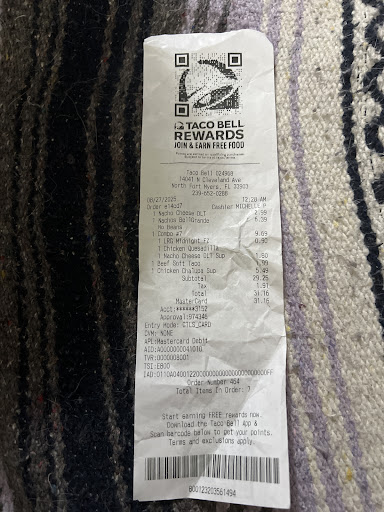 Read moreWe came to this Taco Bell for food around 12:30am, the point of that is the commercials say open late. We usually have a great experience every time we have went to a Taco Bell. Unfortunately this time the person who took our order was not nice nor gave the usual experience we normally get. She was very short and made us feel rushed and uncomfortable, then made us wait even longer when we were ready to order. I do not know if they where short staffed but the food was not made to the usual standard nor where we given our complete order. They forgot the quesadillaas well as the freezy midnight Baja blast that went with the meal. We wanted to order the street taco dishes that they had but clean did not have anything at all as well as other items that we chose to order.We also ordered a chicken Chalupa that wasn’t wrapped and fell apart as we took it out of the bag. Then when we got to open it up and see what fell out, everything was divided sour cream on one side, meat in the middle and minimal meat. When we got the chicken quesadilla it was only cheese with very little meat. We felt this was not worth the money that was spent, nor was the experience worth wanting to go back to this establishment. I do hope that everybody knows that late night is apparently not the right time to go to...