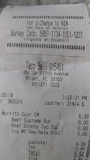 Read moreTERRIBLE ALL AROUND!! Today we visited 2 different stores in Miami Dade. One on 7350 SW 117th Ave, Miami, FL 33183, the other on 13710 SW 88 Street. One as disastrous as the other. Both locations drive thru windows were so congested that cars were blocking the street. Both locations dine in rooms unattended. Neither of them wanted to take our order forcing us to use a machine that did not have the Quesalupa Combo that we wanted. Untrained staff was struggling and managers drowning in the chaotic situations. I cannot tell they were under-staffed but definitely under trained. Bathrooms were locked and uncleaned. Needless to say we walked out of both. SHAME ON YOU TACO BELL, BEFORE COVID IT WAS A PLEASURE NOW IT IS...