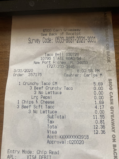 Read moreTwo weeks ago I posted a review that was not complimentary. Line cook had a problem? Mentioned it to Mgr. She addressed the issue. Today stopped in to have lunch and same manager was on duty. She remembered me and came to the register. She explained the issue and did correct it at the time. Today She apologized for the oversite? I am a senior from corporate life. I ALWAYS looked for someone of her caliber to hire in corporate. For the Mgr. to remember me and address the issue is, without a doubt, someone who recognizes the relationship that a corporation SHOULD have with it's clients. It is unfortunate that the majority of corporation's do not instill this kind of response to their management team. I would like to personally thank the Mgr. and the person who she reports to that in these times of NO response to customer issue SHE is a classic example of what a Mgr. should do. She stepped up to the plate. I apologies for not seeing her name tag, my bad. Thank you Taco Bell. A benchmark for what a Mgr. should...