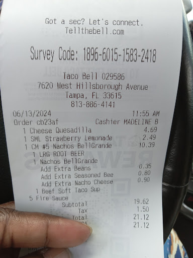 Ā Ā Ā Read moreI had just flown in to Tampa International Airport and decided to get a quick take-out from this store. Upon returning home, I noticed the meximelt was missing from the order, even though it was clearly marked on the receipt. I called the store to tell them. The shift manager - "Shantae" - was unprofessional, starting with her poor phone etiquette. I told her about the missing meximelt, and she insisted that she put it in the bag herself. So, let's add being argumentative with a customer, along with lying about doing something that she never did. She said she would make my order, but I told her I'm not driving 15 minutes from the other side of town. I told her I want a refund. She refused to do that, telling me I would have to call the store manager in the morning. Why do I have to call Taco Bell to chase down a mistake they made? I told her she should call me, since it was their mistake and my money. She flatly told me that would not happen. I then told "Shantae" that I would be calling corporate office about this, and she hung up on me. Let's recap: