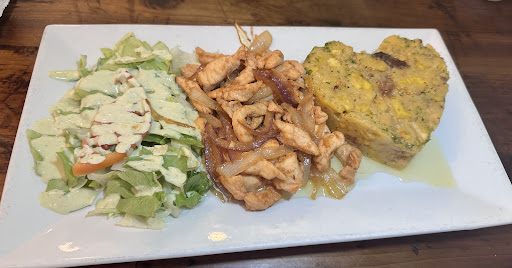 First up was the Chuleta Kan Kan. For those of my readers like me who don't speak a lick of Spanish other than âYo quiero Taco Bell,â a Chuleta is a pork chop. Traditionally, and this was the case here, the chop is prepared using the sous vide technique, thus ensuring even cooking and moisture retention. The Kan Kan part describes the looks of the Chuleta as it is finished with a âMohawkâ presentation, resembling the flared dress of a can-can dancer. While this was prepared flawlessly, it somehow lacked flavor. The sides, however, did not. The rice and beans were intricately flavored, and the house salad, consisting of only iceberg lettuce, was freshly shredded and presented with aplomb. The fried plantains were likewise fresh, hand-sliced, and fried to perfection. As bland as the Chuleta Kan Kan was, the Garlic Chicken Mofongo was as flavorful. This was a 5-star dish and the redeemer of this tasting. Mofongo was created on the island of Puerto Rico with plantains as the main ingredient. Green plantains are cut into pieces and then fried or boiled in broth or roasted. After this, they are mashed with salt, garlic, broth, and oil in a wooden pilon (traditionally speaking). The resulting tight ball of mashed plantains can then be molded and served with condiments. In this case, it was some Garlic Pollo. The Mofongo was flavorsome and had the perfect texture. The accompanying Garlic Chicken was Daedalian in its presentation to the palate. The finishing taste was exceptional.
