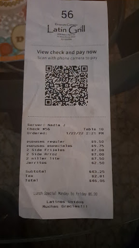 Read moreThe food here is always good... But I went in today and got disturbing sticker shock on our bill. Party of 2, each ordering 3 pupusas with a side of rice and beans. The 3 pupusas were $9.50 and $9.75 respectively. Each side of rice and beans was $7.00!! YES $7! EACH!! I could have ordered a whole kids meal, 2 beers, 3 sodas, or 3 tacos off their menu for comparably the same price as the 4 oz. of rice and 4oz. of beans respectively. My total check for 2 people was $46.06. The beans were literally in a 4 oz. disposable ramekin. Was good, but c'mon man. Raise the cost of the pupusas and other items that can be justified for the price increases. There is definitely not a shortage of rice and beans and it will never be justified to sell 4 oz. of rice or beans for $3.50. Simple food costing at publix pricing for the most expensive refried beans cost $.12/oz. Multiplied by 4 oz. equals $.48/serving of beans cost. Let's even say we double that and make it their cost, so $.96 a serving. At 3.50 that would be 27% cost which is an acceptable cost. But there is no way on God's green Earth that a restaurant can't make 4 oz. of refried beans for less than $.50 cost. I called Cantina Laredo, the most expensive Hispanic restaurant in the area, and their side of rice and beans was $5.52 with tax. The $7 was before tax.So $3 difference. The food is great, I won't deny it, but little things like that deter people that look at...