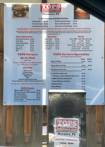 Read moreMy wife and I were visiting Navarre for the weekend and were looking for something quick and easy to bring back to the camp ground. After a short discussion, my wife saw that Tops Burgers was well rated and figured it would fit the bill. I made the short drive, used the drive through and ordered the Cajun Bacon Cheeseburger with fries for myself and Chili Cheese Dogs with fries for my wife. The food arrived in a reasonable amount of time and I was on my way back to our camp site. Despite the name, there was not even a hint of Cajun flavor on my burger. It wasn’t horrible but nor was it remotely Cajun in flavor or style. My wife was disappointed with the Chili on her hot dog but Chili can be a bit subjective especially if you’ve actually had/made good Chili before. Overall, I wouldn’t say our experience was a bad one but nor was it memorable. Bottom line, if your a fan of trying local favorites wherever you go, are in the neighborhood or embrace mediocrity, Tops is a...
