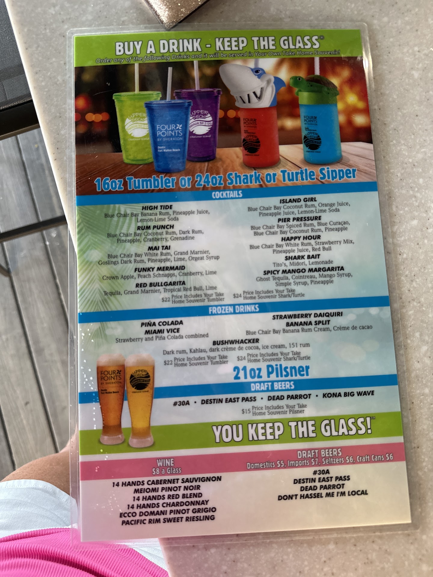 In summary, the beach bar at Marriott Four Points in Fort Walton Beach is a slice of paradise. With amazing drinks, delectable food, affordable prices, and a lively atmosphere, it's the perfect spot to unwind and create lasting memories. And of course, a special shout-out to Alex the Bartender, who truly makes the experience...