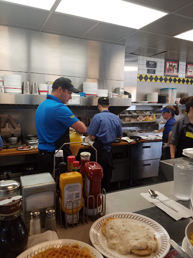 I have been to numerous waffle houses over the years and this Waffle House was hands down the best 1! It was full when we walked in so I was expecting a long wait. we were greeted at the door by a friendly staff member and she told us that they had 1 table open and pointed us in that direction. We were greeted by a friendly waitress as soon as we set down. There was 3 of us and the 1st person that ordered changed his order after the last 1 ordered. Our server was pricing our ticket as we ordered so she had to scribble stuff out and fix it but she wasn't ugly about it in any way and I sure appreciated that. They had 4 people cooking at 1 time. That place was full and we got our food surprisingly quick. It wasnt loud like I would expect. It was so organized and everyone seemed to work great together. The food was delecious. Every bite on every plate was eaten. I would say that the people here should train other waffle...