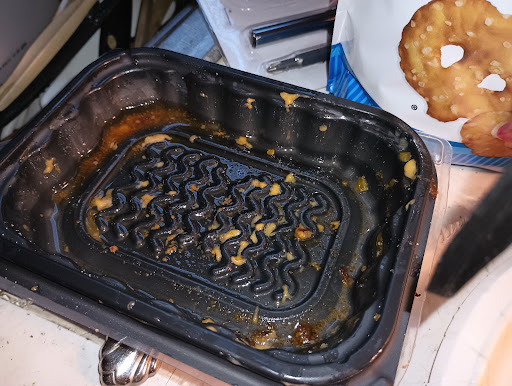 They bring us the chilly cheese fries and a 4 piece and insincerely apologize. If you're following you'll notice that we're still missing the medium drink.