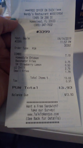 Read moreThis has been the worse experience I have ever had at a fast food place. They now have the worse and under trained staff at this Wendy's that I have been going for more than 17 years. After spending more than 35 minutes in line to place my order, I get to the window they handed me the food and I give them my card to pay, they come back asking me if I have another card because it is not going through, I give them another card and the same situation. This very rude employee tells me that I will need to wait about 30 minutes because they are having issues with their system, I asked him to give me my card back because I was not going to wait 30 minutes more after been in line already for 35 min, he then responded that I was not going to go with the food without paying. I have never taken a dime in my life and this guy did not want to give me back my card implying that I was going to steal the food. I asked to talk to the manager and I understand now why the employee treat me that way, the manager name is Dianelys and she was even worse on the response I got from her. At the end I waisted almost an hour and no food for my family, no customer service at all, people don't care about service anymore. It is sad that I have been a customer for so many years and this is how customer get treated. What is happening?? Not going there ever again and I will make sure to let everyone that I know about this experience. I guess that Burger King or McDonald's will be taking...
