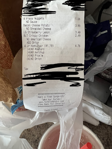 Read moreWorst service and food ever. I pulled up at 3:45. Two cars in front of me. The order taker would only take one order and wait until that person was completely served to take the next order. How unnecessary! I've come to expect this from this location tho. So I ordered 2 jr cheese burger deluxe, and a 10 piece nugget meal with a large blueberry pineapple chiller. I also asked for fresh fries because they always serve cold soggy fries that are clearly out of temp/spec. I also ordered a small frosty. Everything looked to be there so I proceeded home, 3 minutes away. I walked in the door and immediately could tell that my fries weren't cooked fresh, instead, they were re-cooked in the oil a second time. First off this makes for disgusting fries and makes them burnt and chewy. Secondly, cooking foodmlike that has been shows to cause cancer but I am not even gonna go there. My sandwiches did not have the toppings on them and the buns were stale. One even had bacon in it! I didn't order the jr bacon, and even if I did, the other would have been wrong because, no bacon. No tomato on either. My 10 nuggets were room temp at best and half of them were over cooked. Looks like mixed batches that were both out of spec/temp/expired. A very disappointing meal, I gave the burgers to my dog, threw out the "fries" and enjoyed my frosty. I was really happy that at least I could drink my chiller tea. It seems like a premium beverage at that price point and I enjoy the taste. WRONG, it was 75% ice, 24% water and maybe 1% tea. No fruit whatsoever, no taste, it was disgusting and a rip off. I tried calling the restaurant and the phone rang for over ten minutes. What kind of people are running this place!? I had enough. I wish this was the first time this happened, but it's not, I'm just fed up and I...