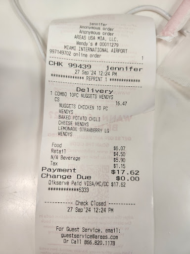 Read moreOrdered two bacon deluxe burger combos. Waitress (Timisha B., receipt 2974, Sept 22 9:57AM) was very uninterested, with one hand operating the register and her head leaning on the other one, she took our order. Not even a hello or welcome to Wendy's.