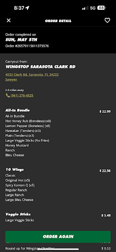 My recent experience at Wing Stop on Clark Rd in Sarasota was nothing short of a complete disaster. From the moment I walked in, it was evident that something was seriously amiss. The atmosphere was chaotic, with a long line of disgruntled customers waiting impatiently for their orders.