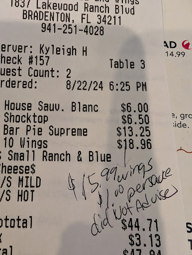 Read more1st time here, Very loud. Got bar pizza and 10 wings. Kayleigh asked us what sauces we wanted and we chose 2 with b cheese and ranch. It took over 35 min to bring out food and it was obvious pizza had sat a while as it was barely hot. We had to find plates, cheese and pepper since a runner brought our food and Kayleigh had not returned. She actually visited out table when we were almost done and we asked for a box. Further when we got the bill, to our surprise we were charged $18.96 for the 10 wings that were advertised for $15.99! When we asked Kayleigh she said oh yeah we charge $1 for each sauce!! We certainly let her know that she did not disclose that to us at time of ordering nor was it listed on the menu. Can't see us going back anytime soon since the experience was poor overall. May 15 2025 went back and service was great. Pizza is so-so wasn't cooked enough and toppings slid off as if the dough had not risen. The chix parm was not good since they changed the bread to a sub style roll and not the crust bread that had made this sandwich so...