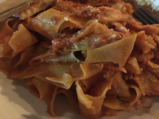 The Food: I was here with family for this visit. Overall, we liked the food. When I get good service, my food tends to taste better. Mood is a taste enhancer. Still, I have to give low marks on the pappardelle with meat sauce. The pasta, presented as homemade, was starchy and too thick, maybe underdone. The meat sauce was scant on the meat. There was no attempt at something special for the dish and it fell short with the gummy pasta. I ended up not eating it. This dish stands in stark contrast to the rest of our food. I tried slices from two different wood-fired pizzas - the classico and the charred vegetable. These are thin-crusted pies served surprisingly fast. The crust was a 7 out of 10, good crunch, airy edge and a nice wood-fired taste without being too charred. The charred veggie pizza was terrific. Same crust with very tasty charred vegetables, dollops of fresh mozzarella and a nice sauce. The fritto misto (translated loosely as "mixed fry") was served with medium shrimp, calamari and finely chopped vegetables. I would have preferred the vegetables to be larger because the tiny diced veggies were overpowered by the fried breading. Still good. My beautiful, vegetarian dining companion had a salad. I cannot remember the name but she had it with strawberries, salmon and mixed greens. The salad's artful presentation was appreciated and she loved it and said she would order it again. The faro and vegetable soup was made with a chicken base and so she was not able to order that.