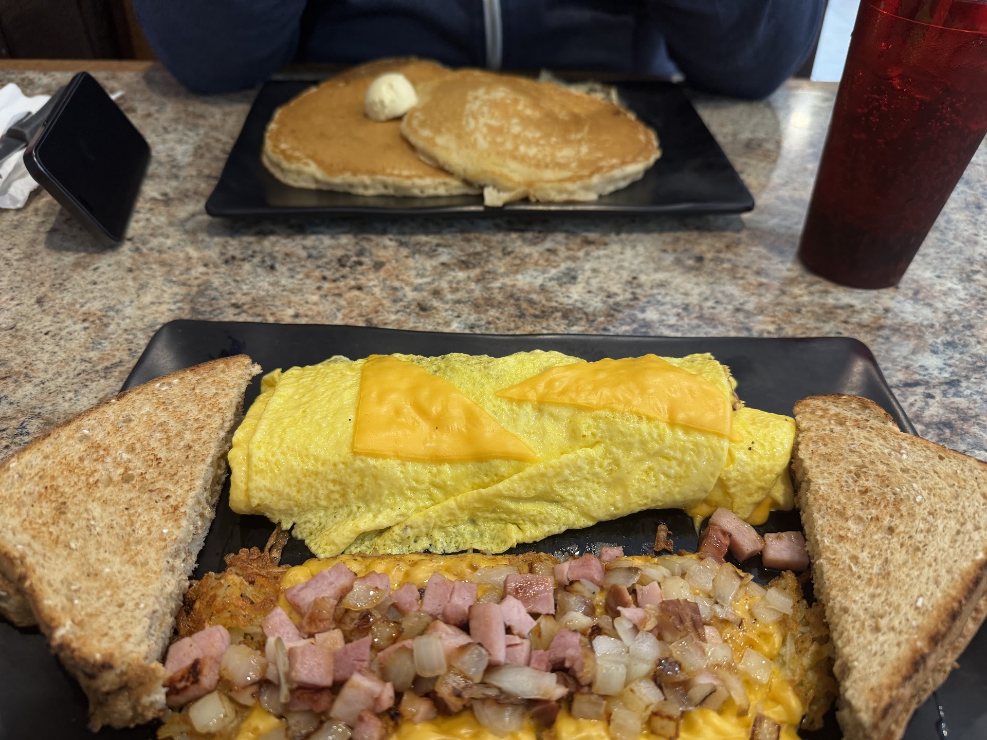 Got: meat lovers omelette with loaded hash browns and wheat toast. Costs around 16 bucks and is beyond ridiculous in portion, but incredible in flavor. Am PAINFULLY stuffed as I write this and I didn't even...