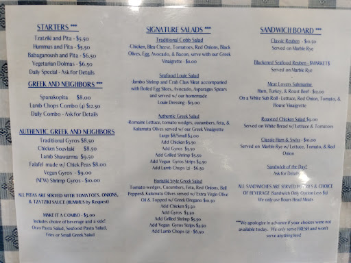 I first became a fan of this restaurant when they showed up with their food truck outside my work at lunch time on NAS JAX. I tried their gyros once, twice with the seafood salad, and a third time again. And then I bought their food again three times afterwards from their restaurantin in Fleming Island. Absolutely consistently great each time. The gyros are so packed with meat and flavors I honestly only eat half of it then and there and save the second half for the next day. Heat it up in the microwave and it's literally as good as it was the first day. Their seafood salad is delicious! Their baklava is a bit wetter than I've had from other places but the flavour is outstanding! I HIGHLY recommend this restaurant. Love them! And the...