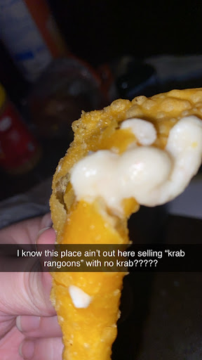This is now the second time I’ve ordered Krab Rangoons from this place and there is no Krab at all in any of them. Not even a little piece of imitation crab meat or anything. They need to advertise that it’s just cream cheese because why am I paying for Krab with no Krab. It had been a long time since I ordered them from here and i had forgotten why I didn’t get them until I ordered them tonight and remembered that’s why. Shame on you guys for falsely advertising this mess.