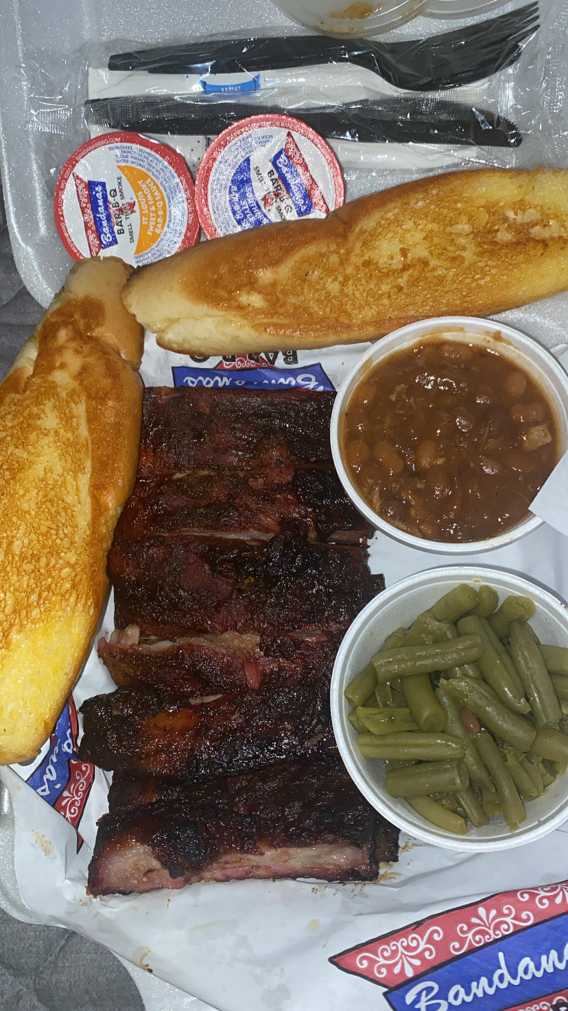 Read moreSooo the hubby had his mind and stomach set on burnt ends specifically from Bandanas, so we met at the St. Ann one first(only bc he called first and was told that they still had some left), but we got there and they were SOLD OUT! Ohh the disappointment on his face, but he was determined so he called the Sunset Hills(kept hanging up) & Maryland Heights locations too(SOLD OUT)...he finally called this location and yup, they still had some available so we made the trip!! Got there and was immediately greeted by Brandie(who was also our server as well as taking care of 2other tables)-she introduced herself and asked what we wanted to start with, so she went to get us waters..she came back and helped me decide which side I wanted(gave me a sample of the potato salad cuz I'm indecisive lol)....we both ordered a coors light which complemented our burnt ends 🔥😋-the potato salad has the perfect balance of sweet & smokey flavor and of course that bread tho!!! We knew the food was gonna be on point-what we didn't expect was Brandie's amazing customer service frfr...keep up the hard work-we can't wait to come back and...