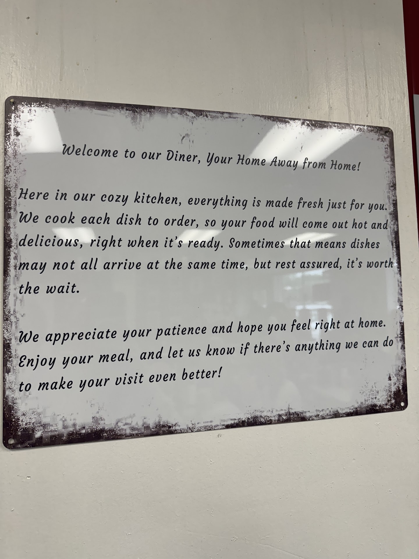 Read moreWe had a disappointing experience here today. Our main complaint was that our food came out all at different times - we came in a group of 4. Part of our meals came out first and we had to wait 10-20 minutes to receive all of our pancakes. I didnât get my pancakes until we would typically be leaving. We had received our check well before this and everyone else was done eating. I mentioned this to a waiter who called over the manager. She was not apologetic and basically explained thatâs how they operate because of the size of their grill and pointed to a sign on the wall I wouldnât have seen (see photo). The sign was behind me so obviously I didnât read it. I asked for a discount due to the experience and the manager said no. If our food had come out a few minutes apart, no big deal, but this was a longer wait than should be acceptable/normal. The food was average - my scrambled eggs were overcooked with brown crust on the bottom and the pancakes were a little burnt on the outside but still tasted alright. I would say, if you decide to visit, just know what to expect. I have told people about this diner in the past thinking they would enjoy, but wonât recommend it any more...