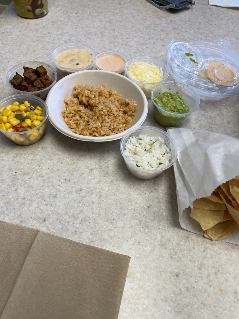Then, it got worse. When three or four employees came in from outside and joined the other two behind the line, I was hopeful that one of them would initiate taking care of us. Nope! One employee jumped in, next to the employee making my soft tacos, and proceeded to FILL FOUR bowls of food FOR HERSELF. She spooned out the last of the chicken -- which I had just ordered, as well as most of the fajita veggies -- which my friend was about to order in his tacos.