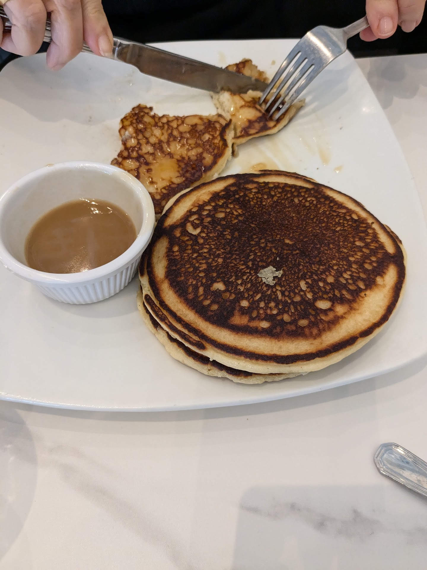 My husband struggled with finding pancakes, eggs and a breakfast meat all together. If you like overly sweet or gravy coated breakfast this is a great spot for you! You will have lots of options. He ended up ordering the simple stack and adding 2 eggs for an extra $4 and sharing my breakfast meat I got with my Country breakfast. He was very disappointed in the pancakes, they were dry and the syrup was like Carmel sauce. I had the country breakfast with scrambled eggs, hash browns, turkey sausage and biscuits with gravy. My eggs were light and fluffy, the gravy was super flavorful but the biscuits were flat and hard. We were both bummed in the no pork options, for breakfast meats. The hash browns were mushy and had no seasoning on them. My drip coffee was ok. I was asked if I would like a coffee to go, that was nice. Over all we spent just over $40 with tip and it was ok but I just donāt think we are the clientele Dix is...