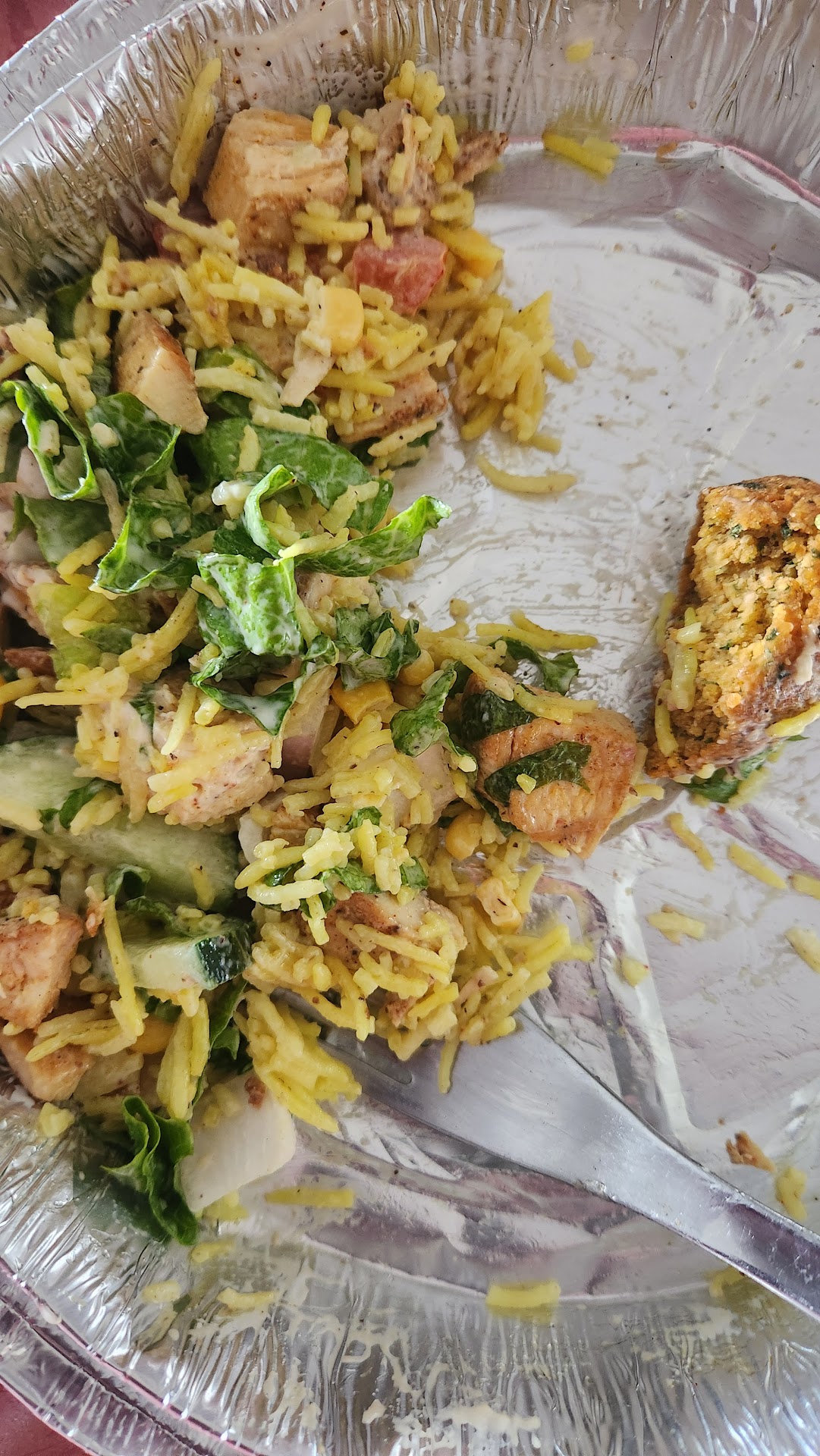 Read moreThis was my first time going here. I was looking for something different to eat online and saw this place. It was about 20 minutes away and looked interesting. It was not busy when we arrived, but the restaurant was big enough to hold a crowd. We got our order to go and as we waited another couple was just leaving after eating. I asked how was it and they couldn't stop talking over each other saying how good it was. It was their second visit and said they will definitely be back to try more of the menu. Sounded good to me. AND I must say I will be following in their footsteps. The food was damn good. All the salad makings were fresh. I saw comments before I came that they gave you too much rice. They must have listened because my portion was perfect. Good ratio of rice and each vegetable and they give you enough for 2 meals for me, but this first time I ate it all and it was great. By my picture you can tell I got busy. Just about to forget to take a picture, oh well. đ I got the chicken bowel my friend got the combo chicken and meats bowl and I got a Greek salad also. The Greek salad didn't get eaten until the next day and it still stayed fresh. Again the portion was perfect and I loved how many Greek olives I got with it. I definitely will be going back. Even if it was $$ on...