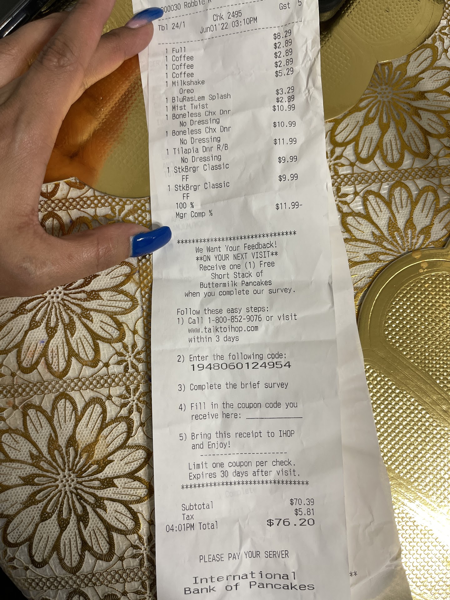 Take my recommendation and find another store to go to. I love iHop but this particular location has taken a turn for the worst. From unseen wait staff, to questionable food safety processes, I can say I probably won't...