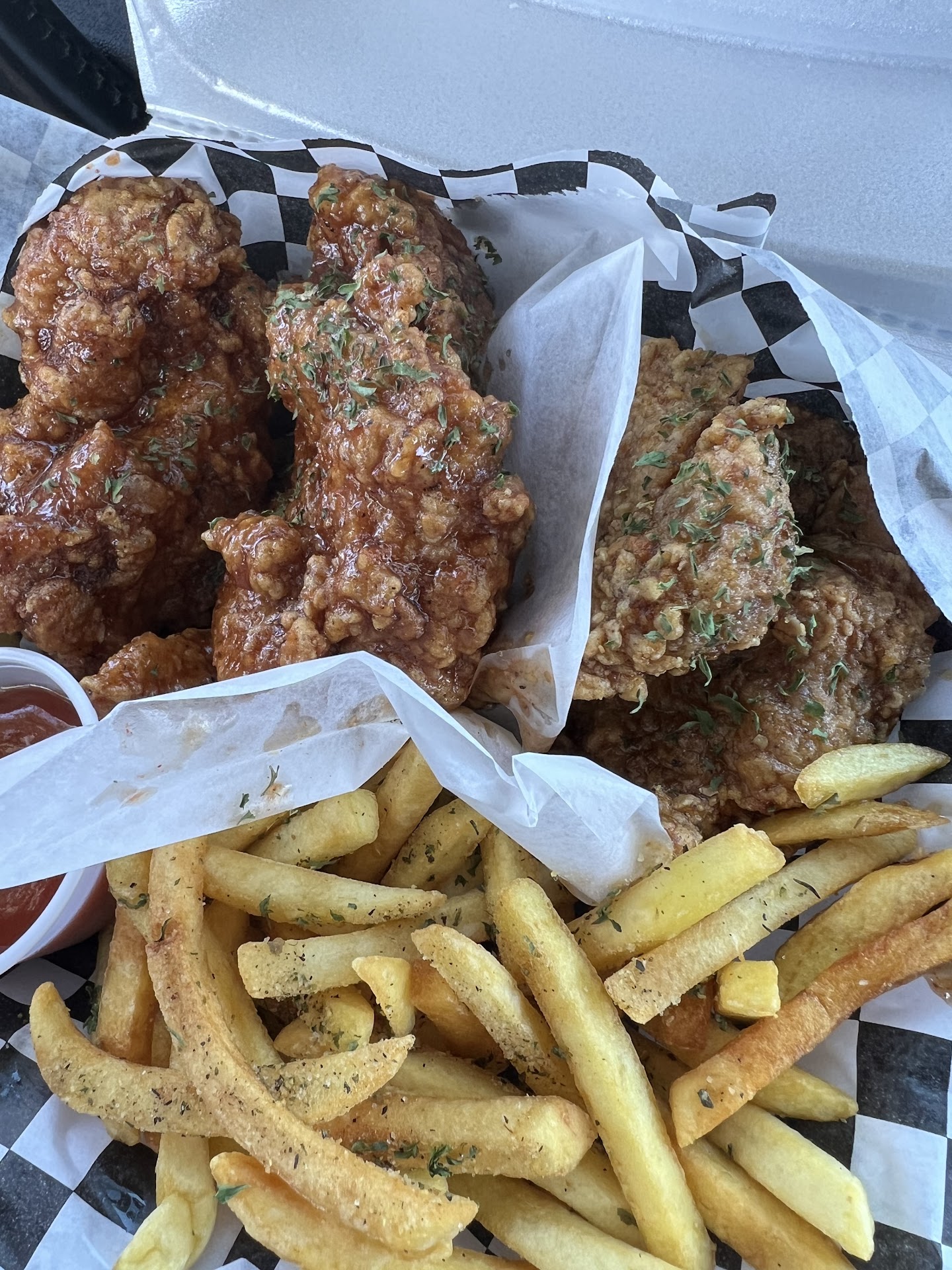 â * Absolutely delicious. We had the soy garlic and sweet spicy chicken and onion rings. Everything was perfect. Flavorful and not greasy.