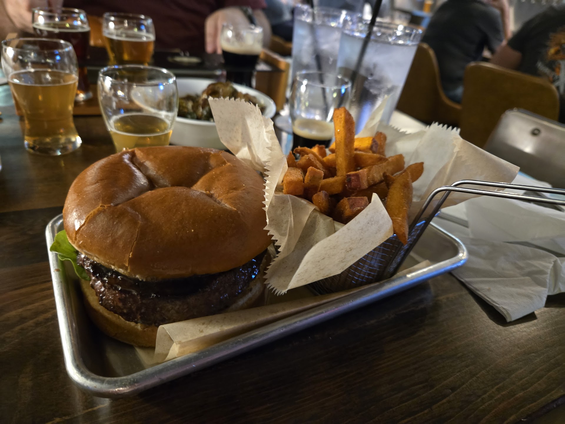 The food menu is fairly limited, but the FM bacon onion jam burger with brie cheese that I ordered was tasty. The waffle fries were hot, crisp, but a tad salty. Of my three friends, two had the house burger and the third had the pretzel. Only the pretzel failed to go over well.