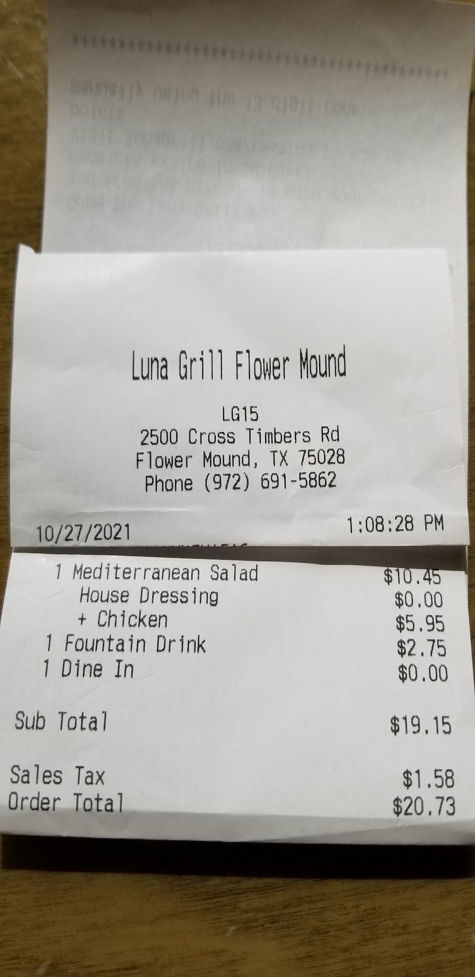 Read moreCustomer Service is really terrible here. Called 9/2/19 at 7:51 PM to place a pick up order. I was on a time crunch and needed to call ahead to save time. First call never got an answer. Didn't think much about it, but called right back. This time I got an answer from a male and his response when answering the phone was "Hello." Not a "Thank you for calling Luna Grill..etc." I thought it was a little bizarre and almost thought I had a wrong number. He was a little slow and didn't catch my whole order, but nothing too terrible. He then told me the food would be ready in 10-15. I was 13 minutes away, so that was perfect. I get to the restaurant and go to the cashier to pick up my food. Lo and behold, my order was not sent back to the kitchen! I was slightly irritated. The girl that was checking on it was NOT assertive and was standing at the computer where the guy who initially took my order had put it in, and never hit "send" I guess for the kitchen to prepare my order. The girl that was standing at the register saw that my order was on the computer and went straight to her her manager. The manager said "Oh Im sorry about that, we can get that out as soon as we can. your total is going to be $21 and some change." I was charged full price for my inconvenience by the manager working this day for THEIR mistake. They were not concerned with my time crunch, and only concerned they got their money. Everyone was unapologetic, which made the whole situation infuriating. Will not be coming back to...