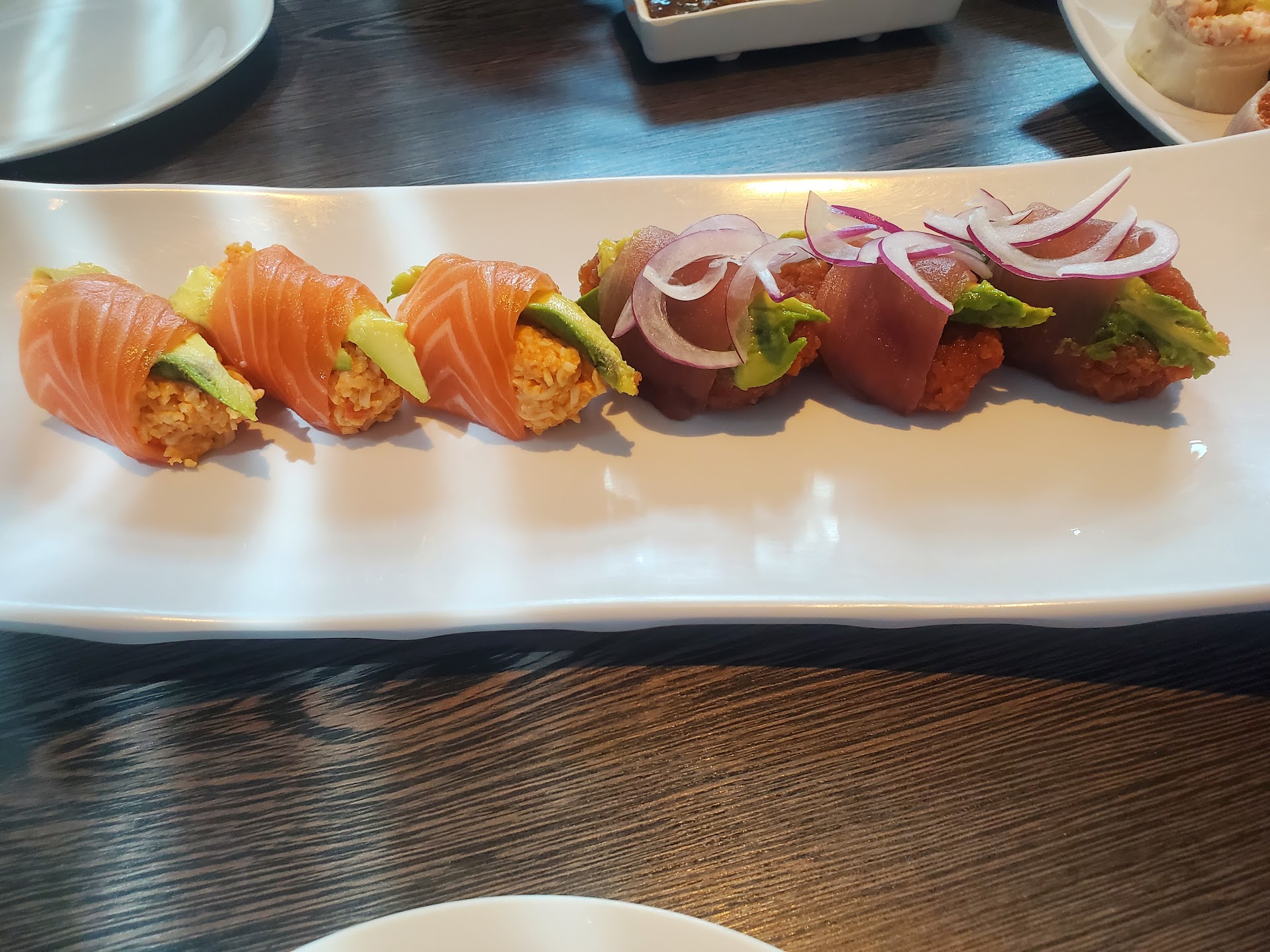 Read moreSushi Damu for being a chain restaurant offers a cute atmosphere where everyone would feel welcome. The pop of color that is intentional to match throughout the entire place including the bathroom. We were quickly seated and the wait staff was quick to take drink orders. After looking over the menu I found myself ready to order 6 or 7 plates of food to check out a variety of items they had to offer. I was surprised that appetizers that we ordered were the last to arrive to the table, very last item was a side salad. All sauces were pretty standard to most sushi places but their season salad dressing was a delight with no overpowering sesame oil, just subtle as it should be. Vegetable tempura, batter what pretty much perfect with the exception of a GIANT piece of broccoli about the size of a toddler fist, producing a completely raw brassica and doughy batter since it was much bigger than the rest of the variety of veggies. The sushi rolls were cut to a perfect size, as no one likes a roll cut into huge pieces where you have to dislocate your jaw to eat.. the rolls had a perfect ratio to filling/rice and not too much sauce on them to take away from the other ingredients, which I apperciate and bow with respect. My real only complaint was the tempura shrimp or what they called "tempura". These arrived to the table and I was confused immediately. The shrimp had nothing to do with tempura but instead they were breaded and glistening with grease. It was like I was sitting down at a steak house and ordered breaded shrimp but no cocktail suace to go with it. There is a huge difference, tempura is a light thin coating not taking anything away from the main star. It was almost like these were pulled from a freezer bag, but I will never know. When I asked staff about this, I was told this is tempura... hmmm... as I pondered my entire culinary education and experience. In no way do I want the "tempura" shrimp to take away from all round good food this place...