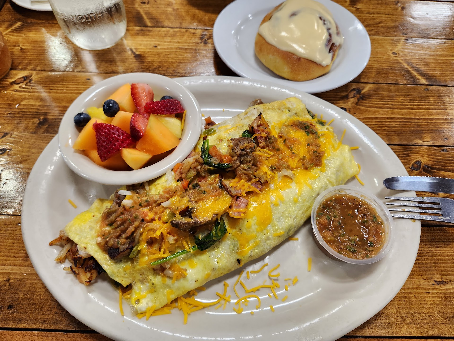Read moreMeh. In a town full of breakfast shops, this place doesn't rate. Speed of service reminded me of the not so long gone Le Peep. Although in true French fashion, the food was often good enough to wait for. Breakfast shouldn't take this long to be delivered after the order. I appreciate it was busy, but it was slow. Waitresses could have been more attentive. I shouldn't have to look high and look to get my coffee topped off. Food was average. Too much cheese in the omelette. Variety of sides was better than at most places but upcharges for a biscuit was a bit odd. GF said the pancakes tasted funny. I thought they were fine. Cinnamon roll is a word I guess you could use to describe it. Beyond that it was about as bad a cinnamon roll I have ever had. It was literally a bun with some cinnamon in it and an awful cream cheese frosting on top. If you must go, avoid this at all costs. (Looking back at other reviews, I see what I consider to be a mouth watering looking Cinnamon Roll. The one I was served looked nothing like that!!!) I'm always willing to give a new place a try and the ratings looked good here and on FMC. I beg to differ. When it comes to speed and quality, Snooty Pig in Highland Village is still the king. We would have walked out of the Pig haven already eaten by the time our food had been served here. Closer by, My Cafe definitely holds its own alongside the Pig. All things considered, I really wasn't impressed with anything to make me want to come back. Ratings...
