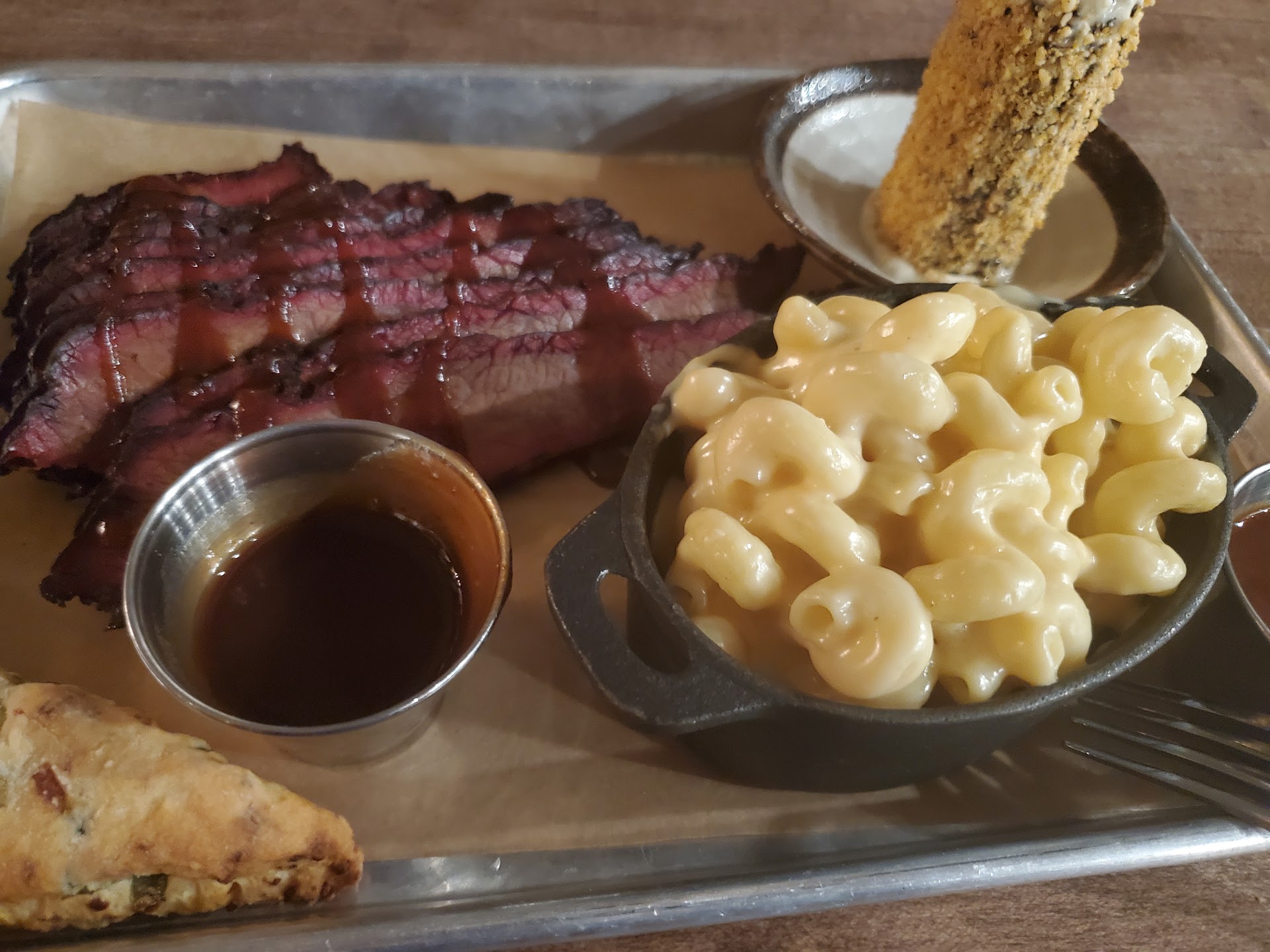 The food— no thank you. Not disgusting for sure- but absolutely not anything my family will crave. Especially for the price. I got the brisket- 1/2 lb. Which is more like 1/4 fat and 1/4 meat. Nothing tasted smokey or smelled smokey at the restaurant. You also order sides a la carte. So it’s not like a 1 meat plate or 2 meat plate. My friend got lollipop wings which were not bad at all!! I tried them and we both really enjoyed the flavor! I don’t know why I expected the street corn to not be on the Cobb— but it was messy and just missed the mark— but it’s so close to being my favorite thing— if Taco Ochos street corn mixed with this street corn- it would be perfect!
