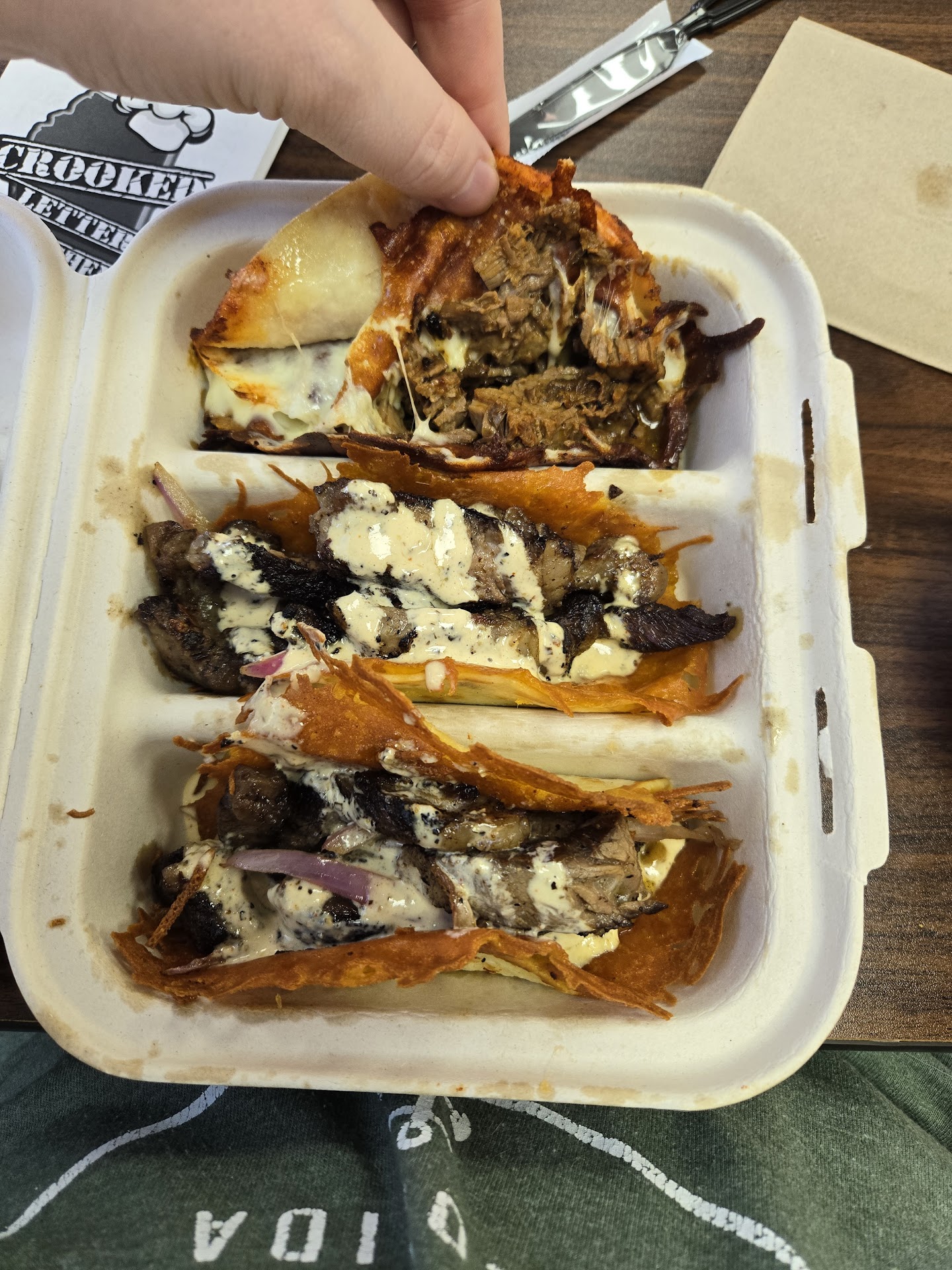 We also ordered a trio of tacos: birria, shrimp, and ribeye. That ribeye taco was out of this world. The meat was so tender and flavorful that putting it on a taco almost felt criminal, in the best way. I just hope they never skimp on that quality of meat because it made the dish. The shrimp taco was cooked perfectly with great flavor, and the birria taco was impressive. I loved how they fried the cheese first before adding the meat. My only small complaint was that the dipping broth had a noticeable nutmeg note. It wasnât bad, just not my personal taste in a Mexican-style dish.