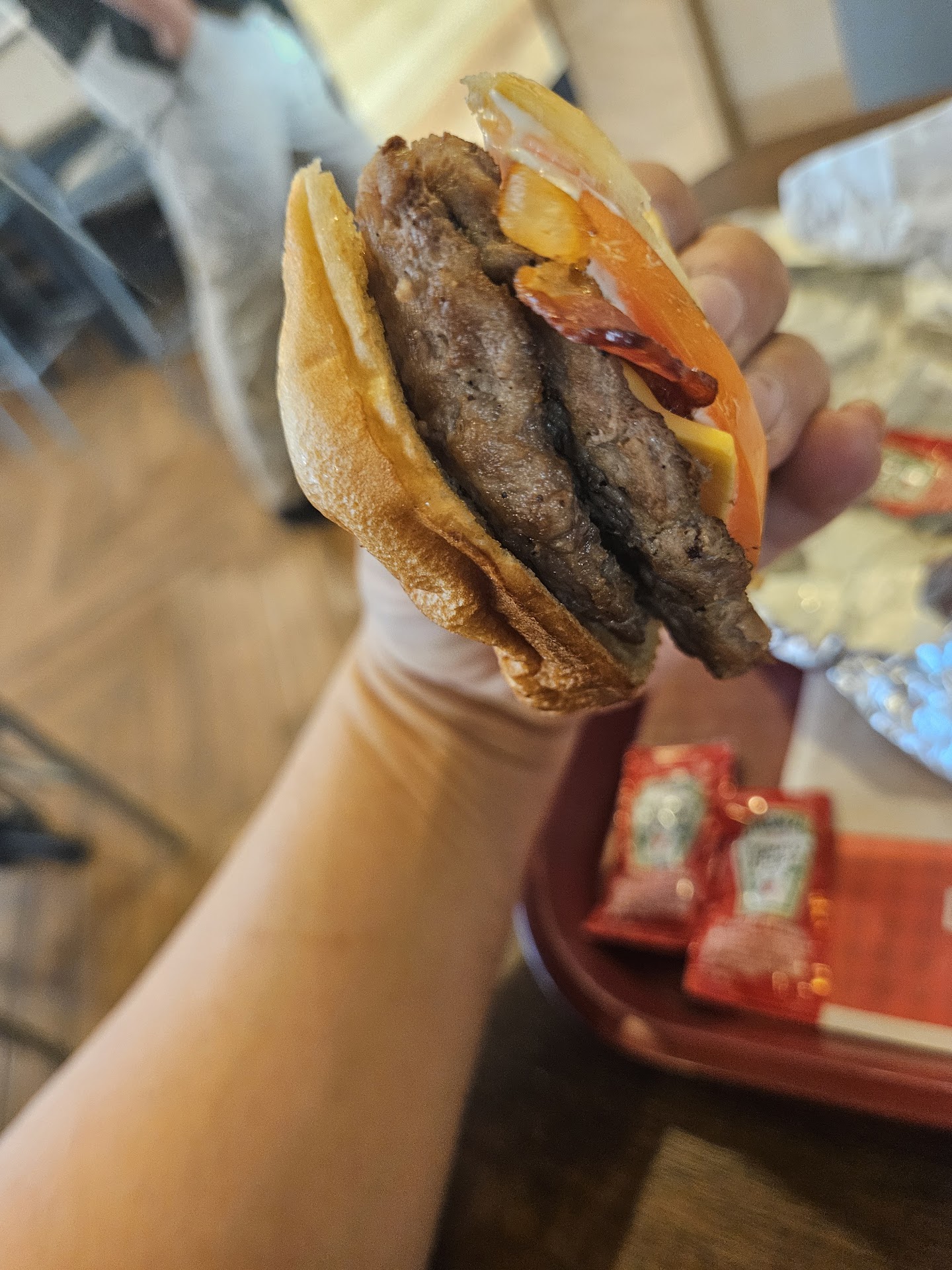 The burgers were good. Small cheeseburgers - as to be expected when you get two of them. Flavorful and seasoned better than the average fast food burger. Jack's sauce, pickle, onion.