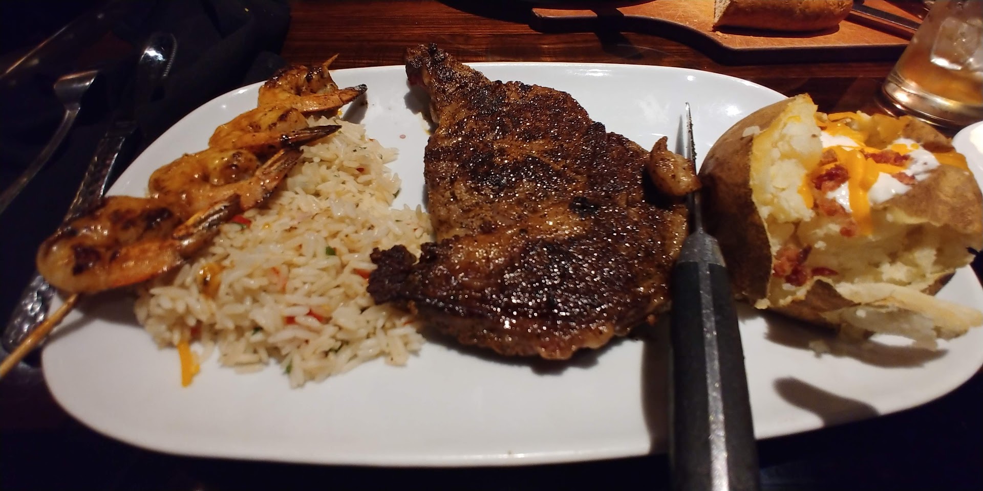 Read moreMy wife and I decided to visit since we had a rare chance to eat alone. The staff was very pleasant and the wait was reasonable. My wife ordered the 6 ounce Renegde steak with the parmesan crust and seasoned fries, I ordered the 12 ounce ribeye steak with shrimp, rice and a baked potato.