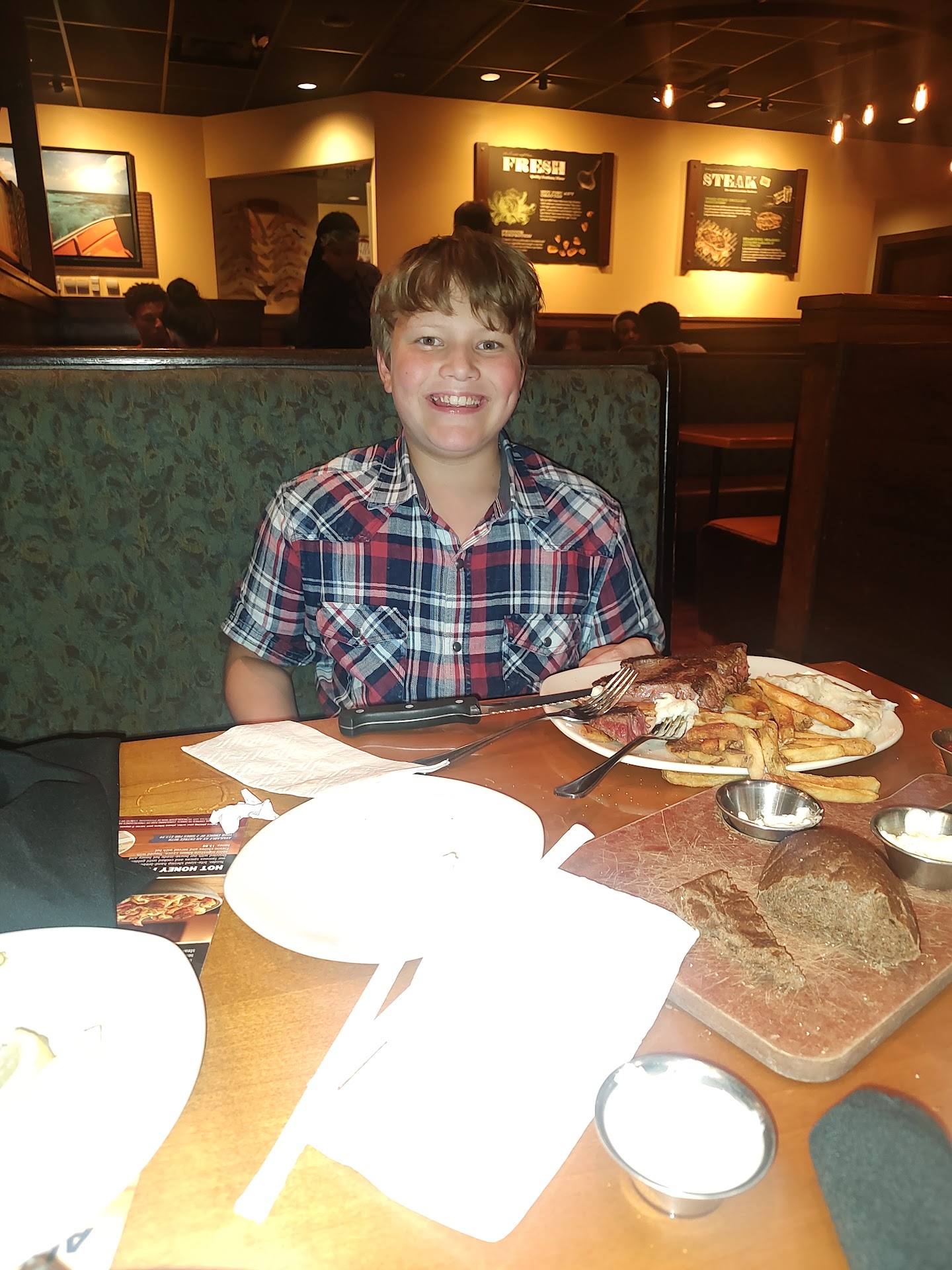 We placed our drink order, appetizer, and meal orders at the same time because we had plenty of time to look over the menu before even seeing our waitress for the first time. It took our waitress almost 15 minutes to bring us our drinks. The Blooming Onion came to us at a reasonable time but that was it. The neighboring table that was seated AFTER we were had already received their meals before our salads were even brought to us.