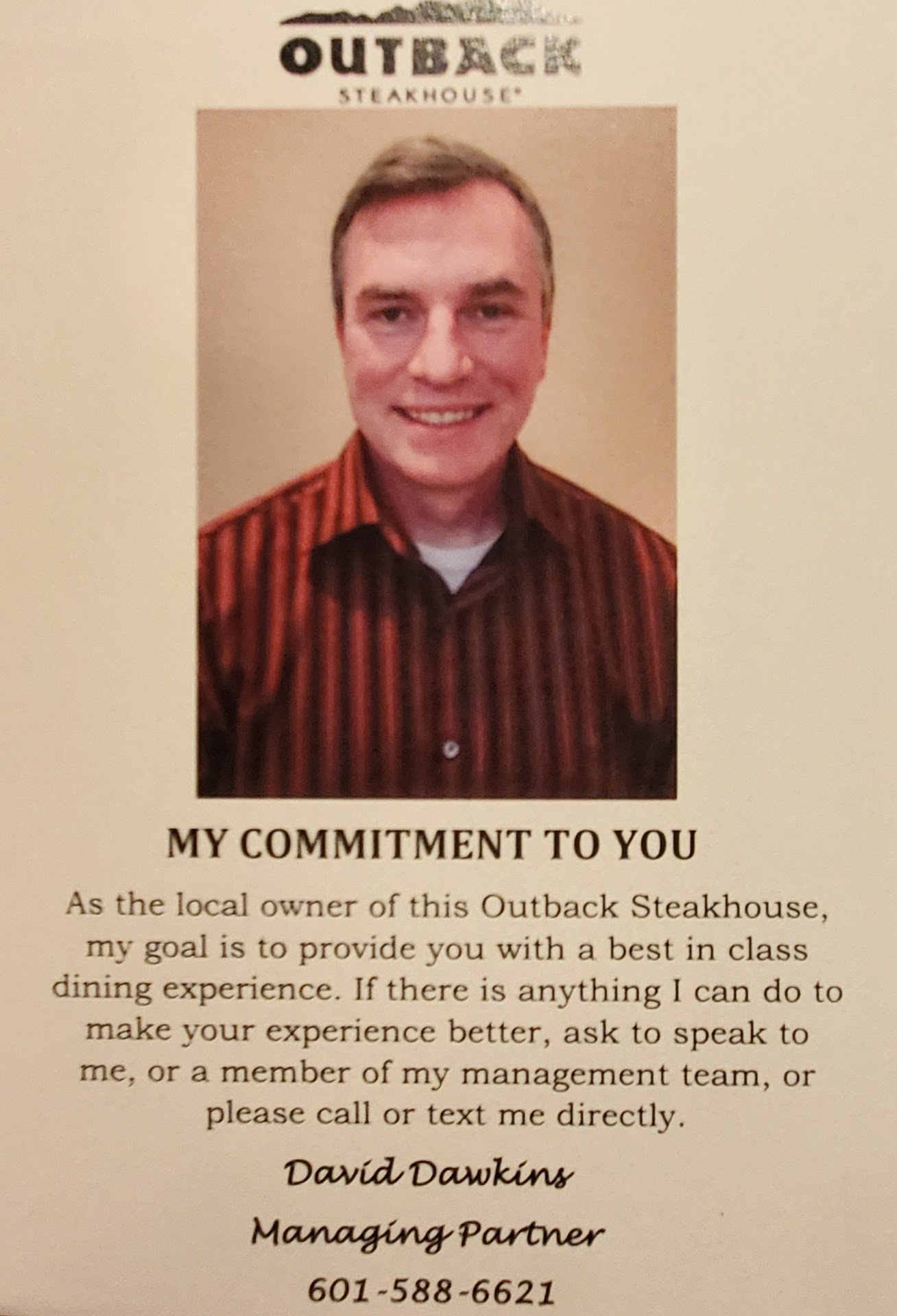 Read moreI can no longer recommend this establishment. This past evening, my wife and I tried to dine here. We put our name on the list using the online site. Once we arrived, we were greeted by 4 people standing at the reception desk. One lady informed us it would be 45 minutes because they were short handed. I took notice in the restaurant that they may have been a third of capacity, it that. Literally, the parking lot was very sparse. I even commented to my wife about it as we were able to park in the front door. I ask if they had received my name for the waiting list? Answer.. no. No, because as they are checking, and laughing because they can’t get it to work. It was during that period, I finally received my confirmation text that I was on the list. At this point, she tells me, it will be 20 to 30 minutes. Really?? There are 4 people standing around doing nothing, plenty of empty tables, EVERYWHERE.. and you are going to make me wait? After your screwups? And, you just standing here in the front door as a group just doing nothing? To make this worse, this was the second time this has happened to us this month. This place used to be good, but they are going downhill fast. My wife and I chose to leave and dine elsewhere. We chose Rain Cains right down the street. They were packed!! But, the line moved quick, and they were very nice and polite. Thanking us for our business. So, Outback Flowood… done with you. Your beef is no better than the one I can get at my grocery store. This outback is not worth waiting 45 miutes for anything they serve. They are not that important. My advice, go somewhere else where they care about...