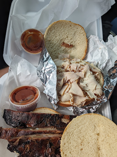 Happened to stop by here on the first day (Jan 19) they opened after being closed for a period of time-i imagine it was closed for the holidays. They are only open Wednesday thru Saturday as well. We had the turkey sandwich, chopped brisket sandwich and rib sandwich. The rib sandwich was $8+ while the turkey was about $5 and I can't remember the cost of the brisket. The rib sandwich was actually three ribs on a bun with smaller bones. It was a little difficult to tear the meat off the bones and make a sandwich out of it. The turkey was cut very thin and reminded me of sliced meat you can get at the local grocery store although it did taste better. The brisket had a spice to it. The ribs and brisket were dry for my taste and the BBQ sauce was extremely runny so it didn't help at least for me. Flavor was pretty good but the dryness was a little too much to overcome. They do have a covered sitting area and they only take cash or checks. It really is about a 3.5 on a scale of 5. Would I eat here again? Probably not. Would I go out of my way to eat here?...