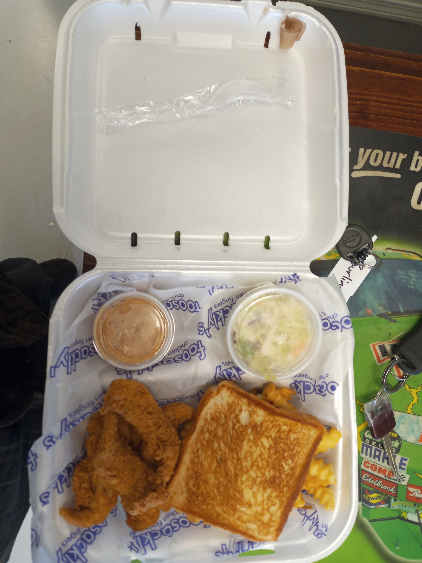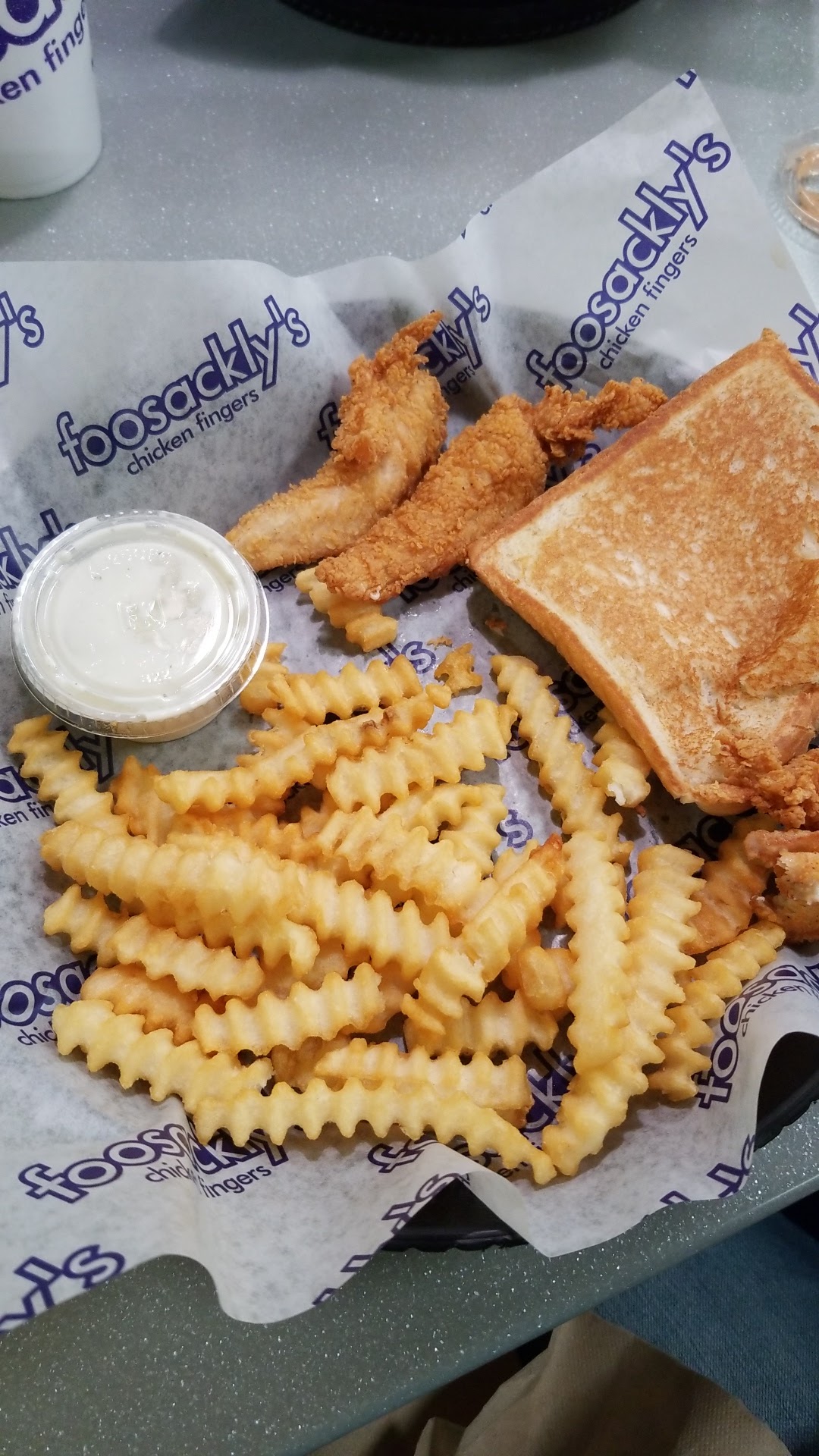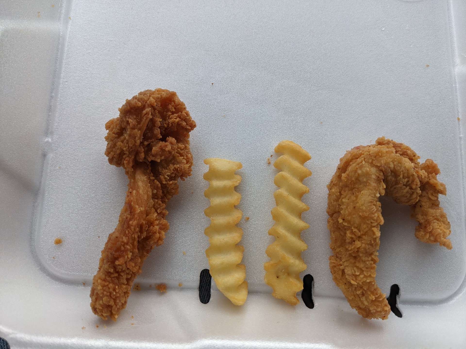 Stopped in for lunch and got the on chicken finger box...$6.09 plus tax. It comes with five chicken fingers, slaw, crinkle fries, a piece of garlic toast and 1 sauce. I chose the sweet and spicy kung foo sauce. The slaw had little to no flavor... actually it was a little bitter. The garlic toast was not real good either. The fries were okay and you get a lot of them. I dipped mine in the sauce and they were better. The sweet and spicy sauce is their version of a sweet chilli Thai.sauce. It was really good. Now for the chicken fingers. They were the smallest chicken fingers I have ever had. I got six instead of five but honestly most of them were only two bites each. The biggest one was probably three...maybe four bites. Really small compared to a place like Raising cane's. I've included a picture of the fingers next to some not so big crinkle fries. The fingers were good, not great. Would I go out of my way to eat here? No; Would I eat here again?...