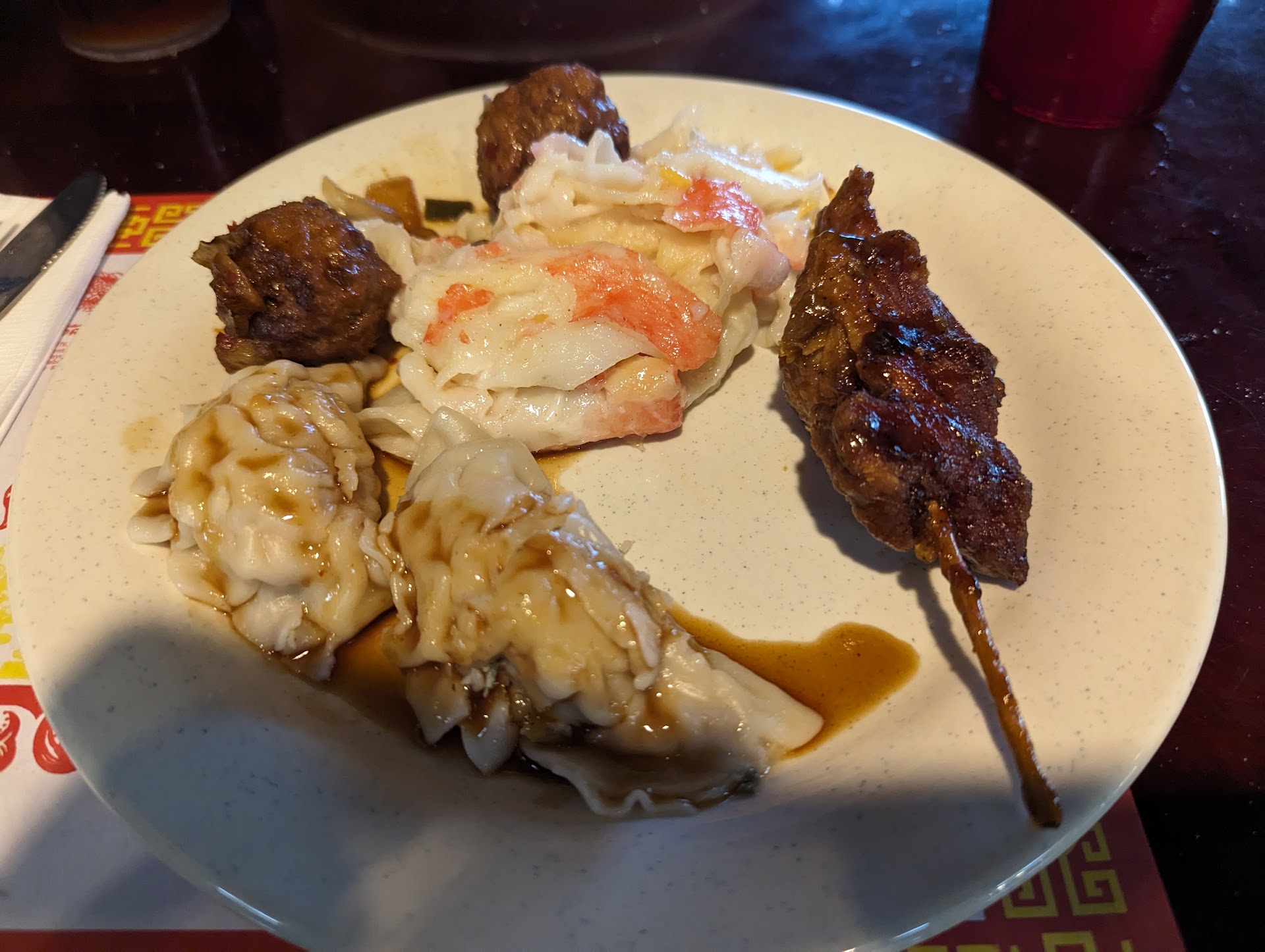 Read moreThis place is extremely below average. I go into places with an open mind and an understanding if people feel off or may be overwhelmed. This place was not that. I went in at 11:30am, 30 minutes after opening. The food selection was severely below average. All of the food I got was cold and most of it had a layer of film as if it was sitting there for hours. The teriyaki chicken was cloudy and slimy, the host told me to sit wherever and then moved me after my choice. They have 3 rows for food but maybe a row and a half of food. The only reason I have them 2 stars instead of one is because the krab rangoons were semi-decent. The restaurant looks like it’s barely cleaned, the servers seemed very stressed and unhappy (I understand the feeling but this seemed universal and chronic.), and the air is heavy.