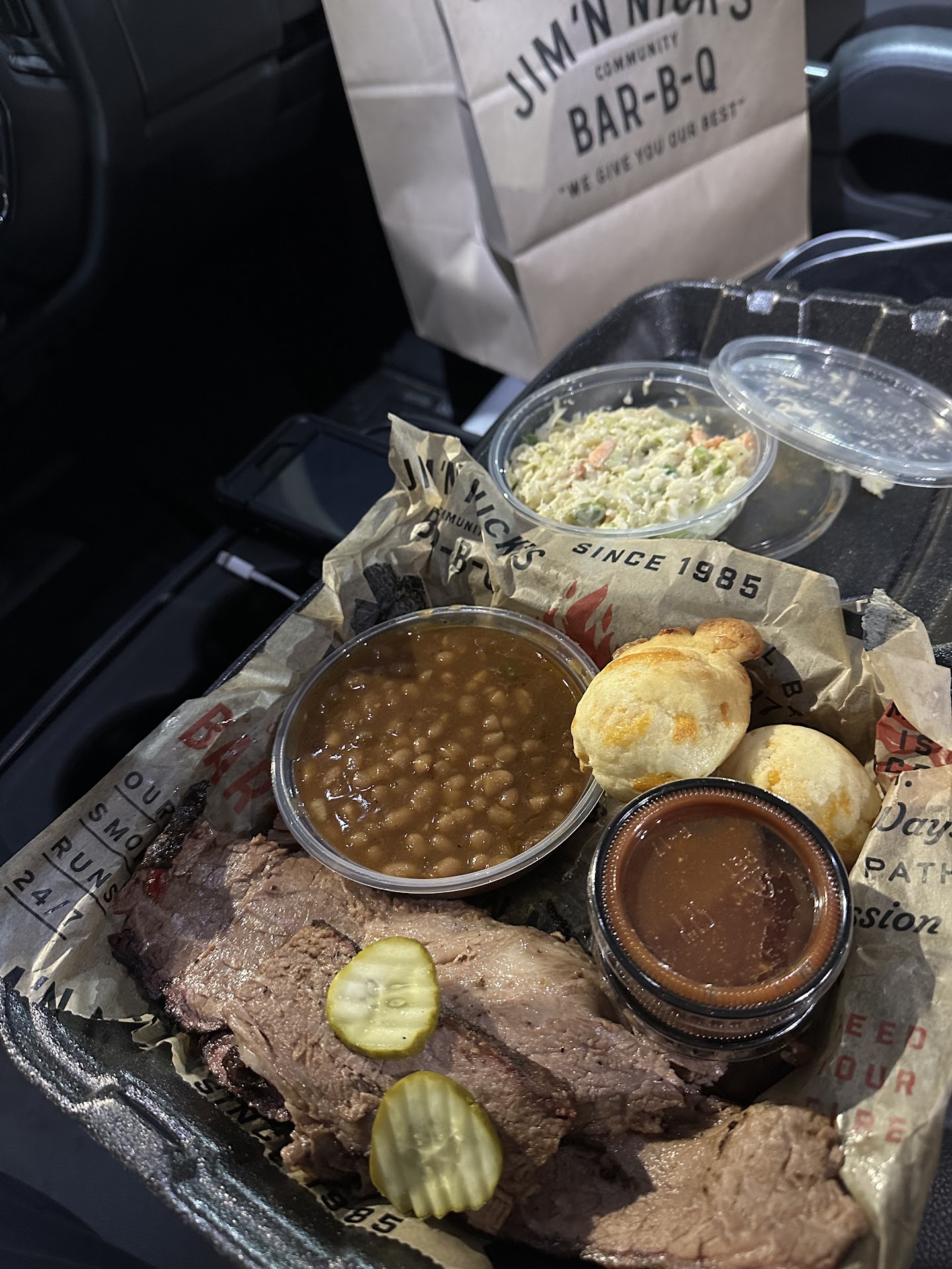 -Service: 5/5: Excellent service. The restaurant as well as the 2 lane drive thru were slammed, yet they still had steady movement. Very nice order takers. Impressed by how quickly they build and send out plates. Congrats to everyone, well done! -Brisket (marbled): 4/5. Not the best out there but still pretty solid brisket. Gave a slight boost after considering how much product they’re pumping out. -BBQ sauce: 4.5/5. Solid sauce. The good spots have 1 main BBQ sauce and that’s all they need! -Baked beans: 3.5/5. Solid baked beans I can’t complain. -Slaw: 4/5: Cold, crisp slaw. Not too heavy on the dressing! -Cheese Biscuits: 4.5/5. Fresh, tasty, included with every plate meal!