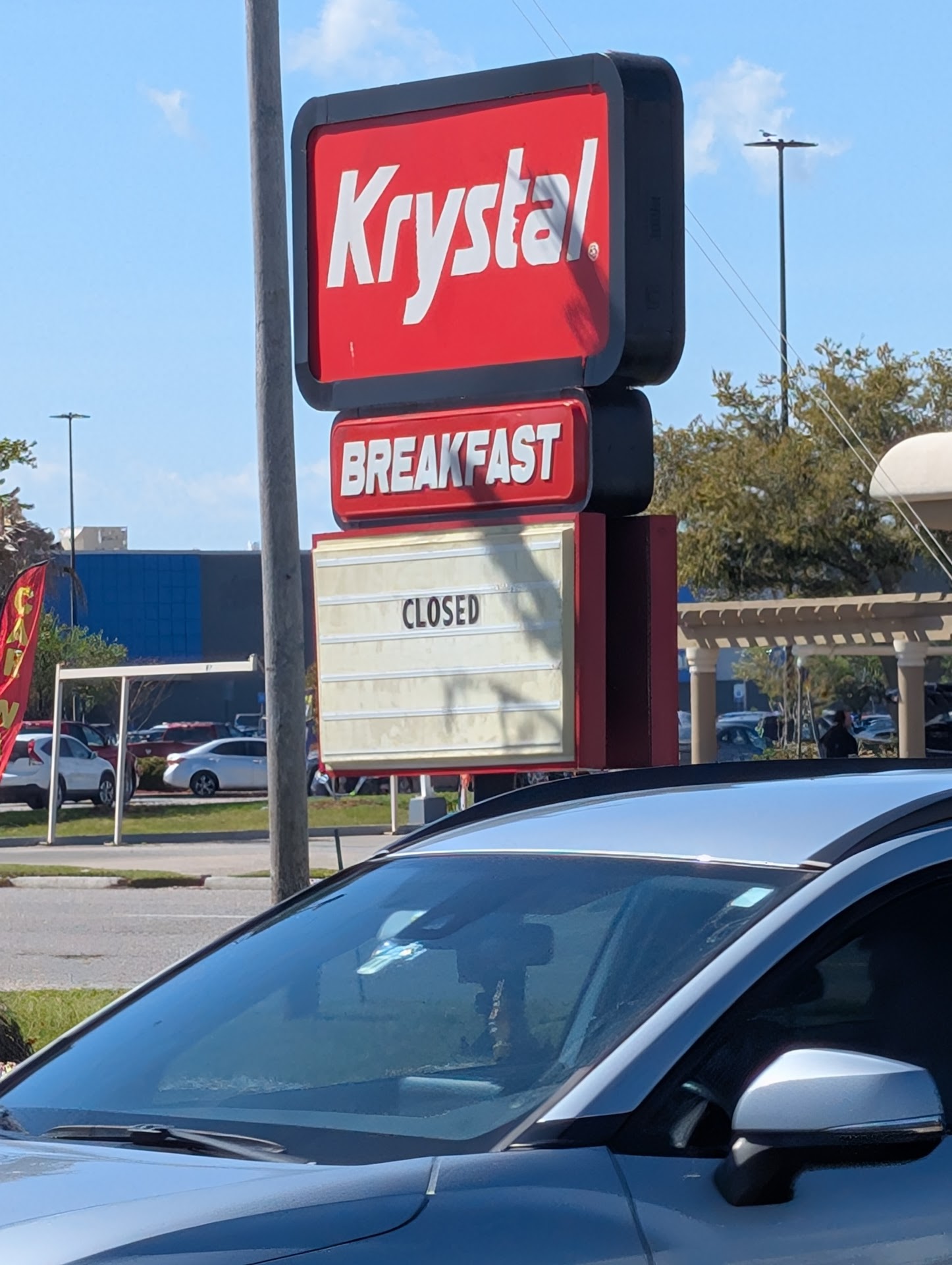 Ā Ā Ā Read moreOn a great day I would give Krystal a 4 star review. Some days their food is decent, but that is only when you get it FRESH. This time when I went I ordered 1 hamburger 1 cheeseburger and 2 Krystal chicks with extra mayo. I legit had to repeat the order at least 4 times before it was read back correctly. The young lady and the window seemed nice but that was about the one and only positive thing about this visit. The hamburger looked like someone had cooked it 5 hours ago and put it in their pocket and sat on it a few times. The meat was very old and the onions were burned. The cheeseburger was just the same only with cheese. Then the poor chicks...for some reason they both came with cheese even though we did not ask for any. Thankfully they did not charge me for it and it was still cold so it peeled off easier than if melted but I'm certain that it had to do with how old and crusty the chicken was. The outside was so old it wouldnt break off at first and the inside was so dry. Needless to say I think my girlfriend and I ate a total of 4 or 5 bites. It may be more understandable if we went right before closing or dead of winter but it was between 4-5pm. I really do wish they would do better though because when they good and fresh I really enjoy...